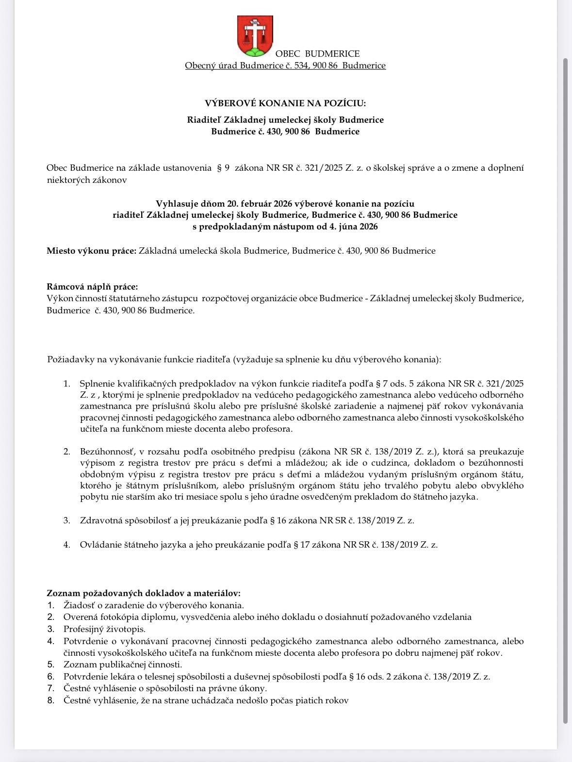Výberové konanie - riaditeľ ZUŠ Budmerice